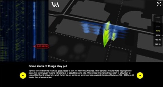 這種可視化,即“Big Glass Microphone”能夠在十分鐘以內(nèi)把電纜中的數(shù)據(jù)提取出來,這些電纜以傾斜向一邊的8字形狀埋在地下6英寸深處。從可視化數(shù)據(jù)圖中,我們很容易可以看到三種不同程度的振動(dòng)波動(dòng),分別是汽車、大型噴泉和自行車行人造成的波動(dòng)。受全球最大裝飾和設(shè)計(jì)藝術(shù)館維多利亞和阿爾伯特博物館(Victoria and Albert Museum)的委托,這項(xiàng)可視化工程將會(huì)于2018年在館內(nèi)展示。